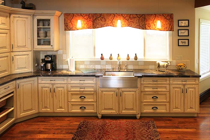 “How do you say thank you to a team that finds a way to add more counter space, finds a craftsman to create a backsplash with french wine case lids to make a marvelous kitchen; and a tiny cabinet from India, an oriental carpet and rare travertine floor tile to create a jewel of a powder room? Wall colors, fabrics – all their suggestions make our petite maison merveilleuse! Merci Beaucoup M.L. and Wendy.” |